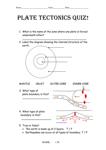 Our online plate tectonics trivia quizzes can be adapted to suit your requirements for taking some of the top plate tectonics quizzes. Where it melts into magma and rises back up to the surface. These ocean trenches form when two oceanic plates collide. The upper mantle and crust make up what major tectonic … Practice for plate tectonics quiz.